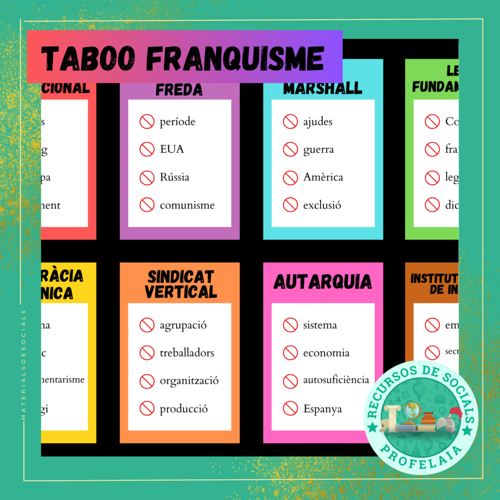 64 cartes de Taboo amb conceptes del tema del Franquisme amb 4 paraules prohibides en la seva definició. Segueix el temari d'Història d'Espanya de Segon de Batxillerat.