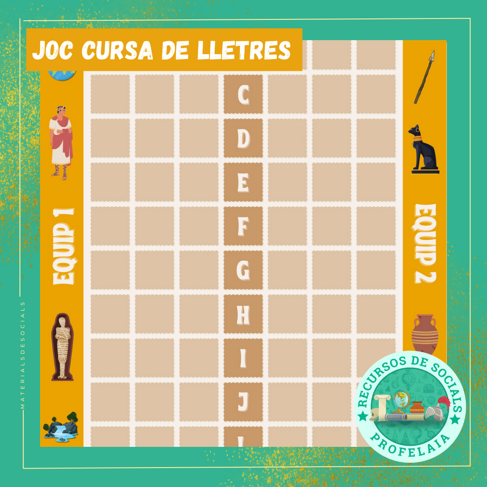 Un joc de taula per repassar el vocabulari més important de geografia i història del temari d'ESO1. Consta d'un tauler de joc, 24 cartes de lletres, les normes del joc i 48 cartes amb categories.